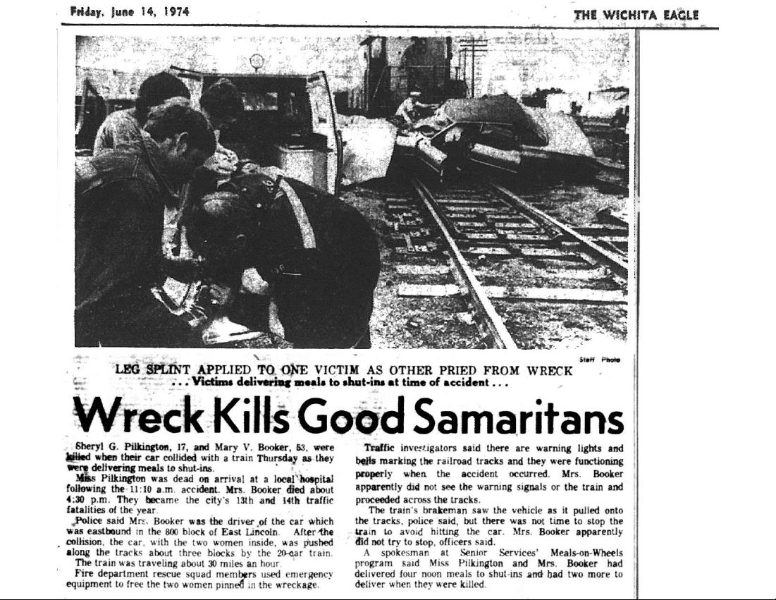 This was the situation on Thursday, June 13, when Booker and Sheri set out to deliver a Meals on Wheels route. Just as the pair were about to deliver the last two meals, the car Mary was driving was struck by a train and pushed for three blocks. Sheri was pronounced dead on arrival at the hospital while Booker died a few hours later.