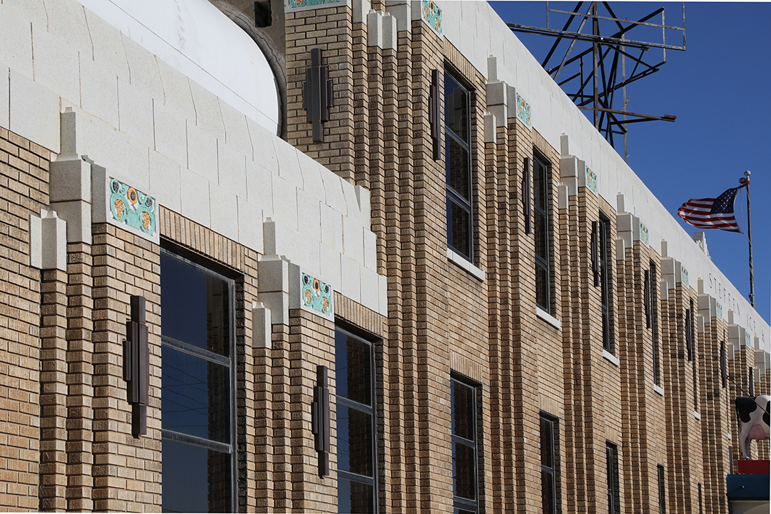 The Steffens Ice Cream building on Central, now home to Hiland Dairy, represents heavier commercial use of Art Deco design, Bradley said. While best known for the large cow attached to its front, the 1931 building features terra cotta graphics, medallion light fixtures and what Bradley called the “stair-stepping” pattern characteristic of Art Deco, created by a series of set-backs of similar forms.