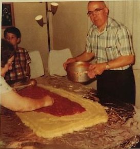 Susan’s grandparents, Rose and Dominic Capranica, are shown making polenta. ” They used to just spread it on the table and we would all gather round with a fork and eat it off the table!” Peters said.