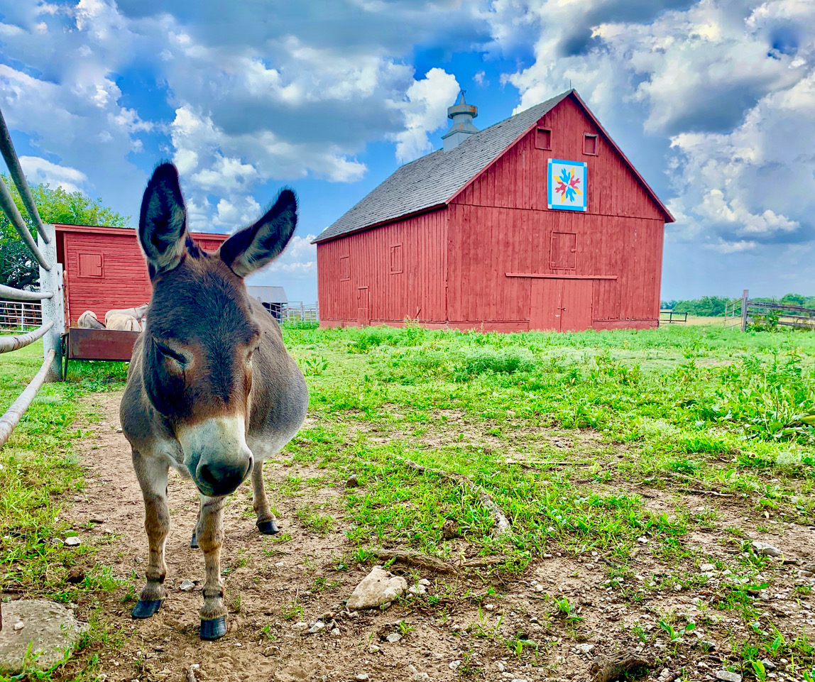 As we drove up to the Ingalls’ homestead, I imagined that I was seeing Laura’s book come to life. There’s a pretty little white farmhouse with a hand-dug well outside. Nearby is a small log building that I’m thinking is some kind of shed. A buckboard wagon stands in the yard, ready to be loaded with supplies. And there’s a sleepy-looking donkey who ambles up to the corral fence to greet us. He quickly loses interest when he sees that we have no snacks, then wanders back toward the big red barn with the colorful mosaic above the hayloft door.
