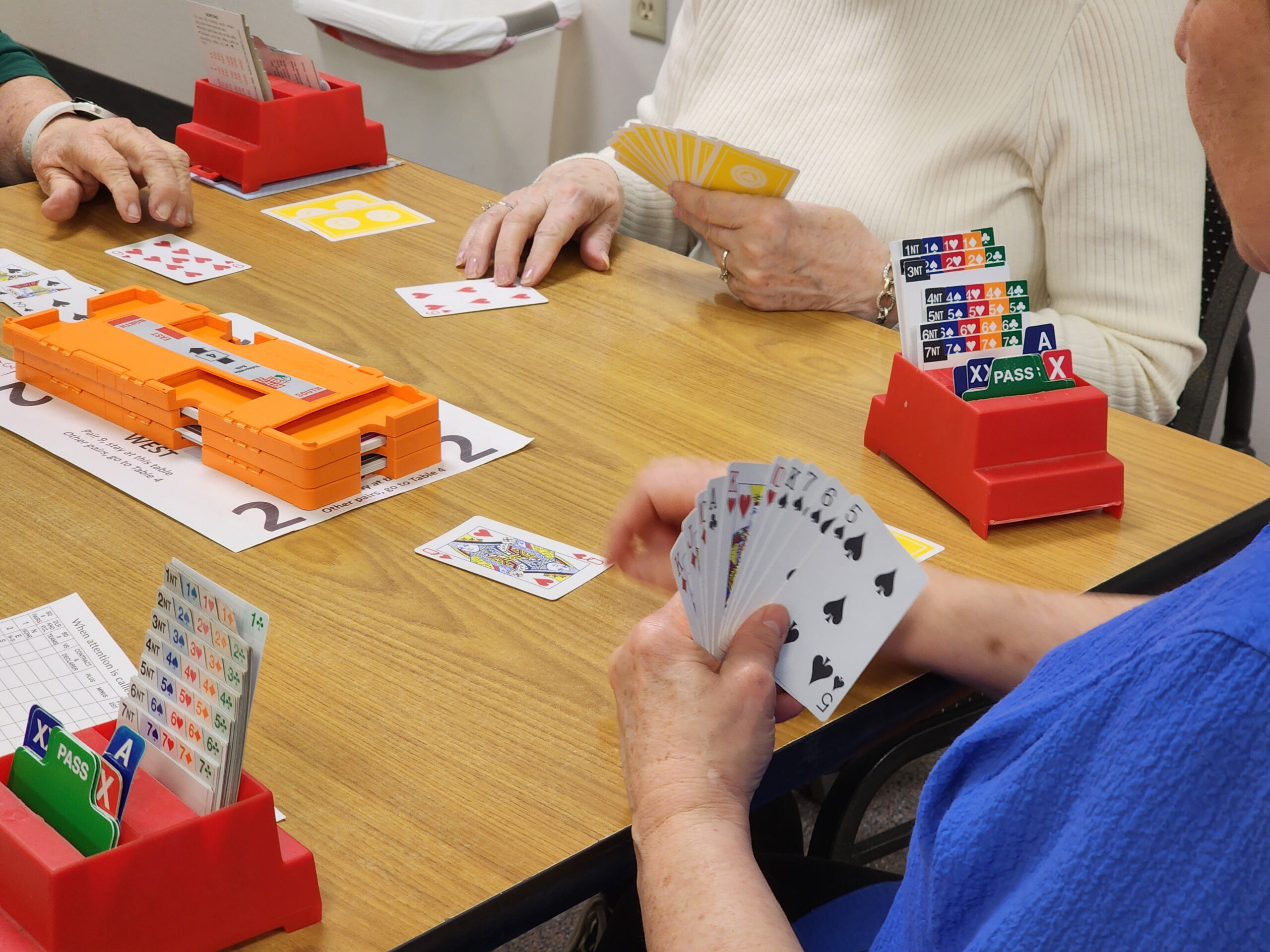 All of the games are a form of bridge called duplicate bridge, which is slightly different from party or social bridge, explained Beck. Instead of playing random hands as in regular bridge, each hand is played — or duplicated — at all of the other tables.